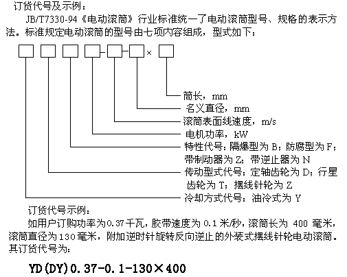 (2).用戶訂購逆止電動滾筒時,須注明旋轉(zhuǎn)方向,如不注明則為任意方向。其表示方法為在特性代號后加“S”(表示在電機(jī)引出線一側(cè)觀察,端蓋應(yīng)順時針旋轉(zhuǎn))或“N”(表示在電機(jī)引出線一側(cè)觀察,端蓋應(yīng)逆時針旋轉(zhuǎn))。